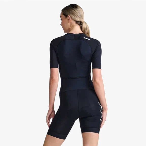 The 2XU Core Short Sleeve Trisuit for women features a seamless finish that provides unbeatable aerodynamics, and is ergonomically designed to fit your body like a second skin. The top of the suit reduces heat absorption and provides 50+ UV protection, while the mesh ventilation channel at the back enhances breathability to maintain optimal performance temperature.