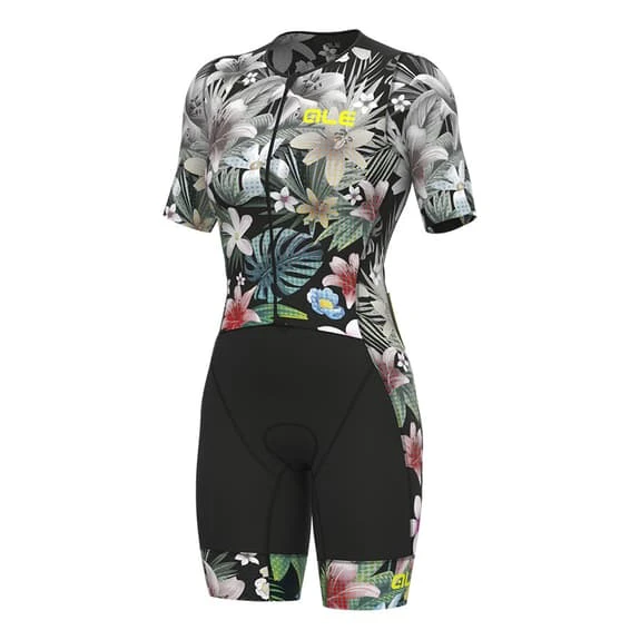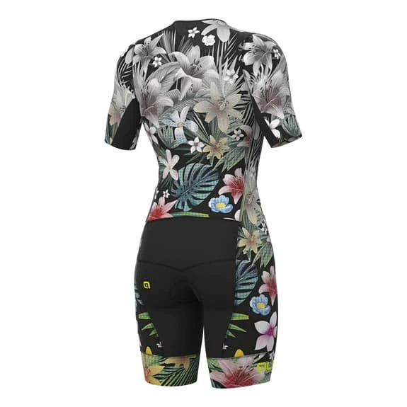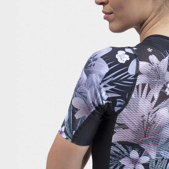 The Alé Sartana women’s short-sleeved trisuit has been designed and tested by professionals of the three disciplines, making it an ideal garment for all three disciplines. Its close-fitting construction combines perfectly with great ventilation and breathability in both the front and back. The back pockets have been designed for ease of use during cycling and running. The fabric of the back has no UV protection to be more breathable. It includes the New Tri chamois, specifically designed for triathlon events.