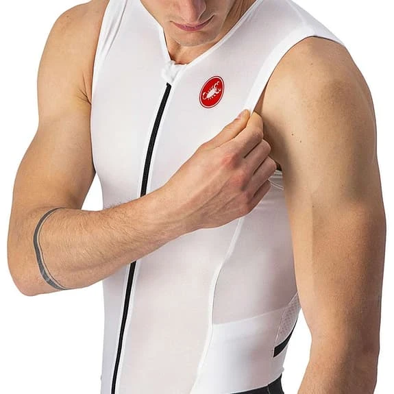 The Castelli Free Sanremo 2 Rosso Corsa sleeveless triathlon suit has all the features needed to perform well during a triathlon. It is a very comfortable garment for all disciplines: running, cycling and swimming. The Sanremo opening at the front follows the shape of the body when cycling and during running makes it easier to open during stops for physiological reasons and during races in high temperatures. The fabrics are light and cool, and guarantee quick drying. The chamois is comfortable on the bike and you hardly notice it while riding. The two back pockets compress the gels so they don’t bounce around. GIRO4 flat band at the end of the leg that is longer for greater aerodynamics. Somehow, you’re thinking that comfort helps you go faster. This garment benefits from the aerodynamic research of Castelli’s Pro PR Suit, but the cut is tailored for medium to high speeds. The legs cover sufficiently, while the back provides good sun protection and the two pockets offer capacity for sports supplements. You will appreciate Castelli’s expertise in chamois construction. Head down and overtake a few more triathletes. Reduced seams and longer leg lengths help cut off water, while pockets lie flat and do not fill with water. The fit is snug and the lightweight fabrics don’t hold as much water. The shoulder area is highly elastic for freedom of movement, even under a wetsuit or competition swimsuit.