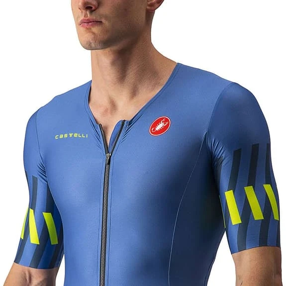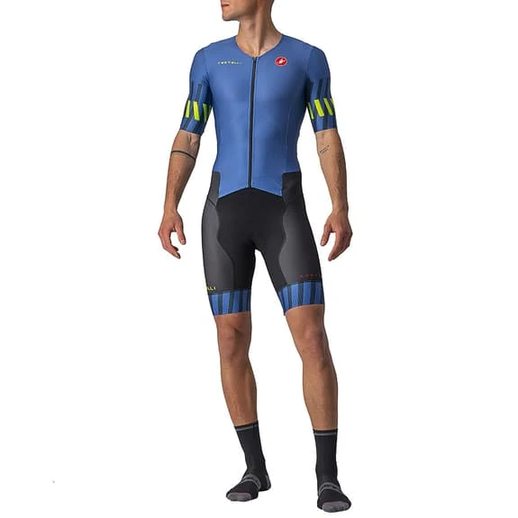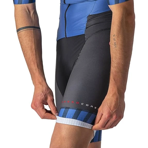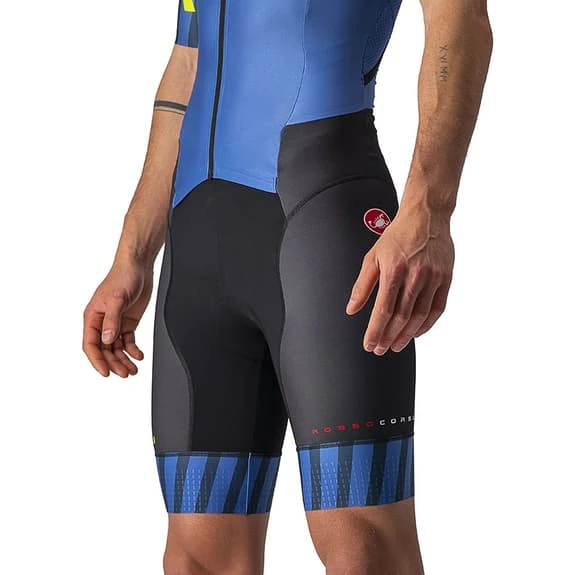 The Castelli PR Sanremo 2 Rosso Corsa Triathlon Suit meets all the features for its good function during a triathlon. It is a very comfortable garment for all disciplines: running, bike and swimming. The Sanremo opening in the front part follows the shape of the body when you ride a bicycle and during the foot race it facilitates its opening at stops for physiological reasons and during races with high temperatures. The fabrics are light and fresh, and guarantee fast drying. The pad is comfortable on the bike and you barely notice it while you’re running. The two back pockets compress the gels so that they do not bounce. GIRO4 flat band at the leg termination that is longer to offer greater aerodynamics. Somehow, you are thinking that comfort helps you go faster. This garment benefits from the aerodynamic research of the Castelli Pro PR Suit, but the cut is adjusted for medium and high speeds. The legs and sleeves cover enough, while the back provides good sun protection and the two pockets offer capacity for sports supplements. You will appreciate the knowledge of Castelli in regard to the construction of badanas. Lower your head and overtake a few more triathletes. The reduced seams and the longer length of the sleeves and legs help to cut the water, while the pockets remain flat and do not fill with water. The fit is tight and the light fabrics do not retain as much water. The shoulder area is highly elastic for greater freedom of movement, even under a wetsuit or competition swimsuit.
