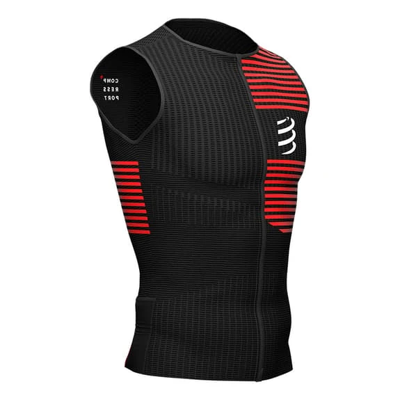 The Compressport Triathlon Postural sleeveless T-shirt is lightweight and second skinned to provide high performance ventilation, postural support and integrated pockets for the racing experience. For maximum comfort and zero chafing, it includes an integrated postural support to help keep the shoulders straight and the core occupied during exertion. It has some back pockets to keep nutrition and personal belongings. In addition, its longer design on the back prevents unwanted skin exposure between it and the shorts on the bike.