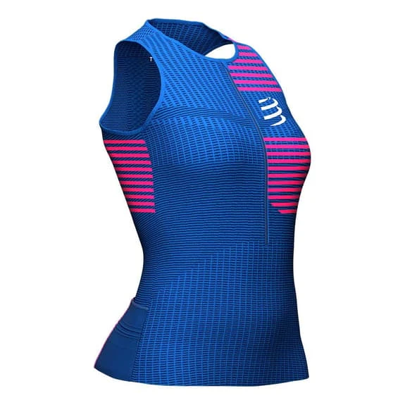 The Compressport Triathlon Postural sleeveless T-shirt for women is lightweight and second skinned to provide high performance ventilation, postural support and integrated pockets for the racing experience. For maximum comfort and zero chafing, it includes an integrated postural support to help keep the shoulders straight and the core occupied during exertion. It has some back pockets to keep nutrition and personal belongings. In addition, its longer design on the back prevents unwanted skin exposure between it and the shorts on the bike.
