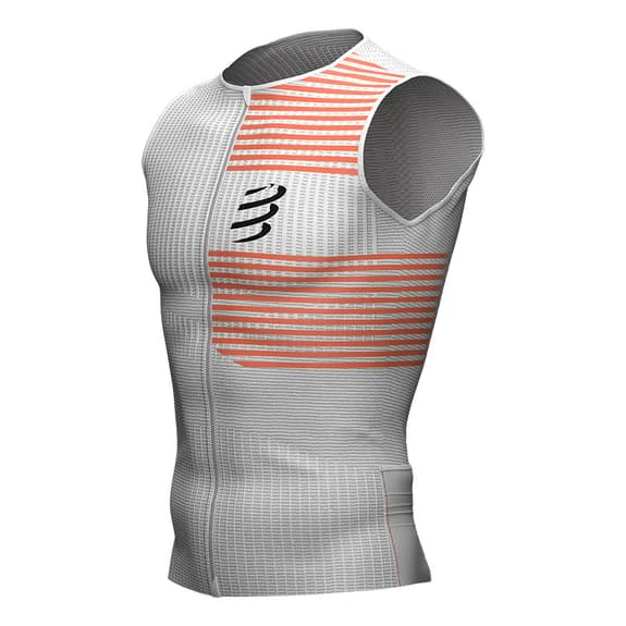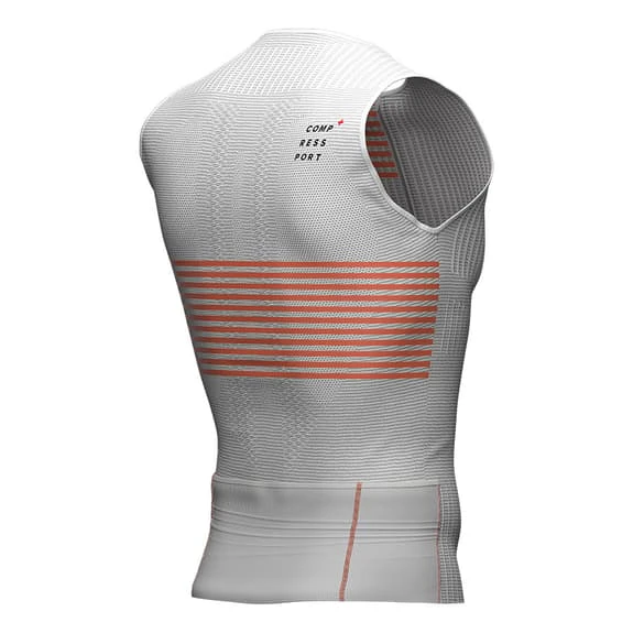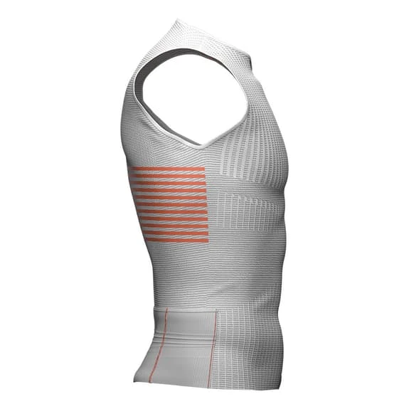 The Compressport Triathlon Postural sleeveless T-shirt is lightweight and second skinned to provide high performance ventilation, postural support and integrated pockets for the racing experience. For maximum comfort and zero chafing, it includes an integrated postural support to help keep the shoulders straight and the core occupied during exertion. It has some back pockets to keep nutrition and personal belongings. In addition, its longer design on the back prevents unwanted skin exposure between it and the shorts on the bike.