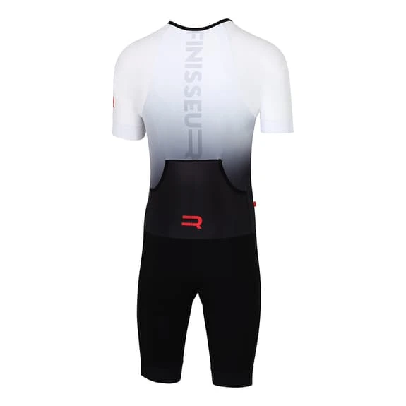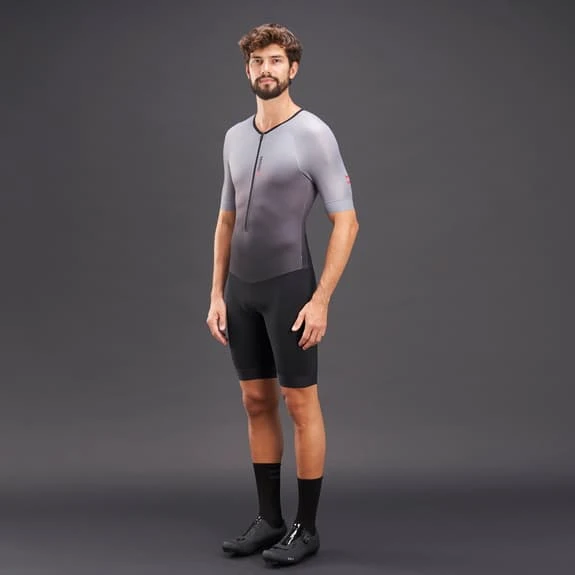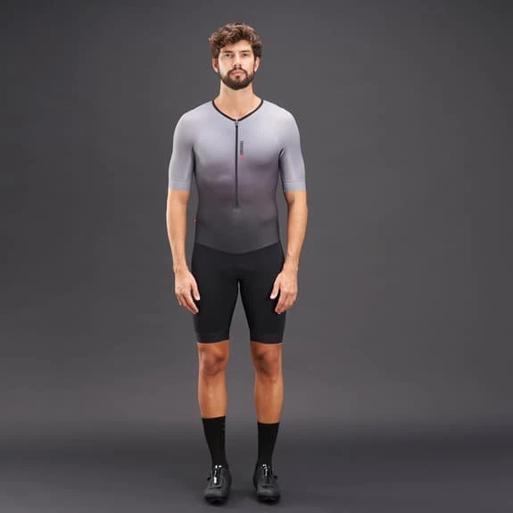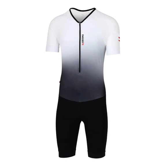 The Finisseur Pro Gradient short-sleeve trisuit is made from a new aerodynamic fabric that is water and chlorine resistant. The drying is very fast, improves swimming performance, and makes transitions much more enjoyable.